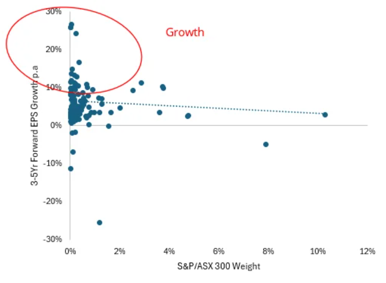 In Chart 1 below, each dot represents a company in the S&P/ASX300. The bigger the company, the further along the horizontal axis the company is. CBA, the largest company on ASX, is the dot farthest to the right. The size of the company is plotted against its 3 to 5-year forward earnings-per-share (EPS) growth estimates. You can see the companies with the highest expected growth tend to sit outside the top 10.