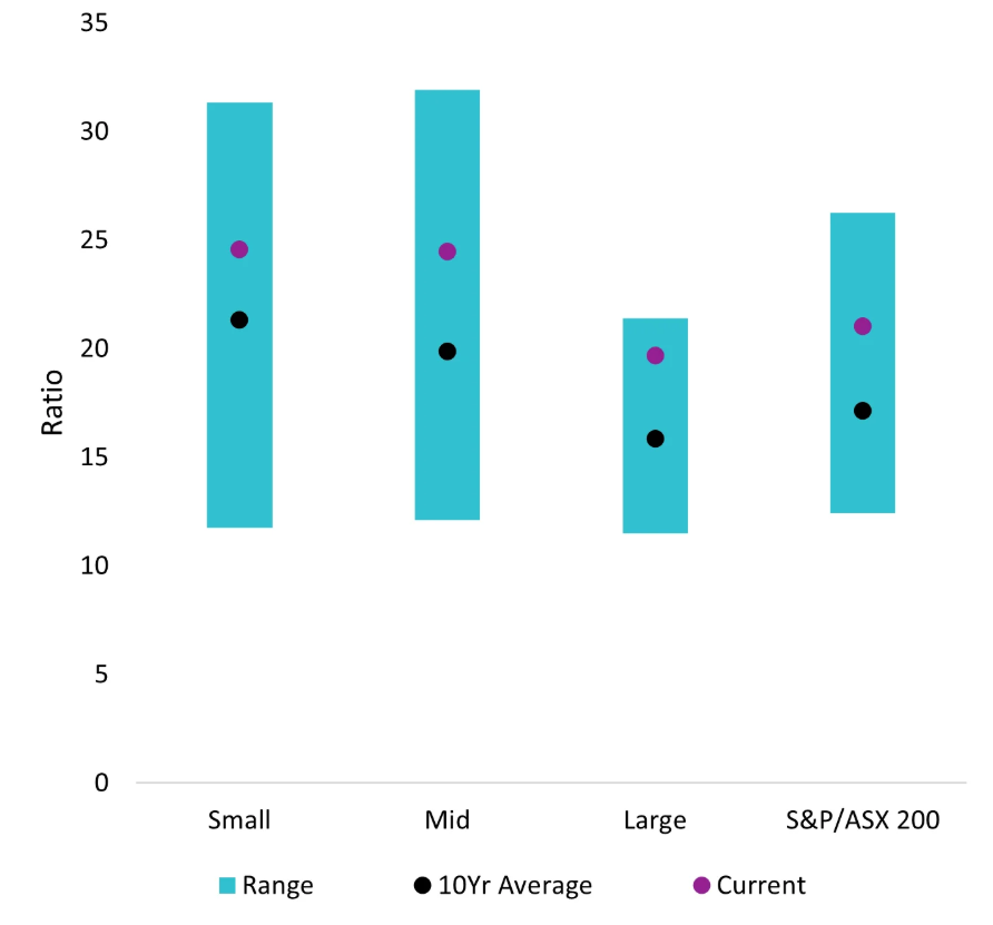 Source: Factset, VanEck. Bloomberg. Large cap is S&P/ASX 20 Index. Mid cap is S&P/ASX Midcap 50 Index. Small Cap is S&P/ASX Small Ordinaries Index.