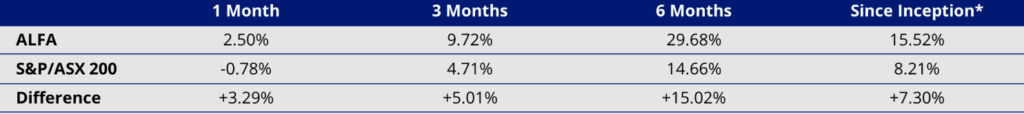 ALFA has outperformed the S&P/ASX 200 by 730 basis points (bps) since inception.