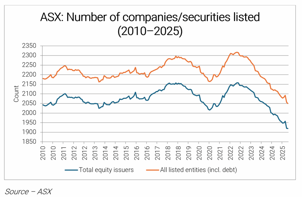 However, as shown in the chart below, the number of listed companies on the Australian Securities Exchange has steadily declined since its peak in 2022. Hence, our pond is shrinking, but like all markets, there are two sides to the equation that need to be unpacked.