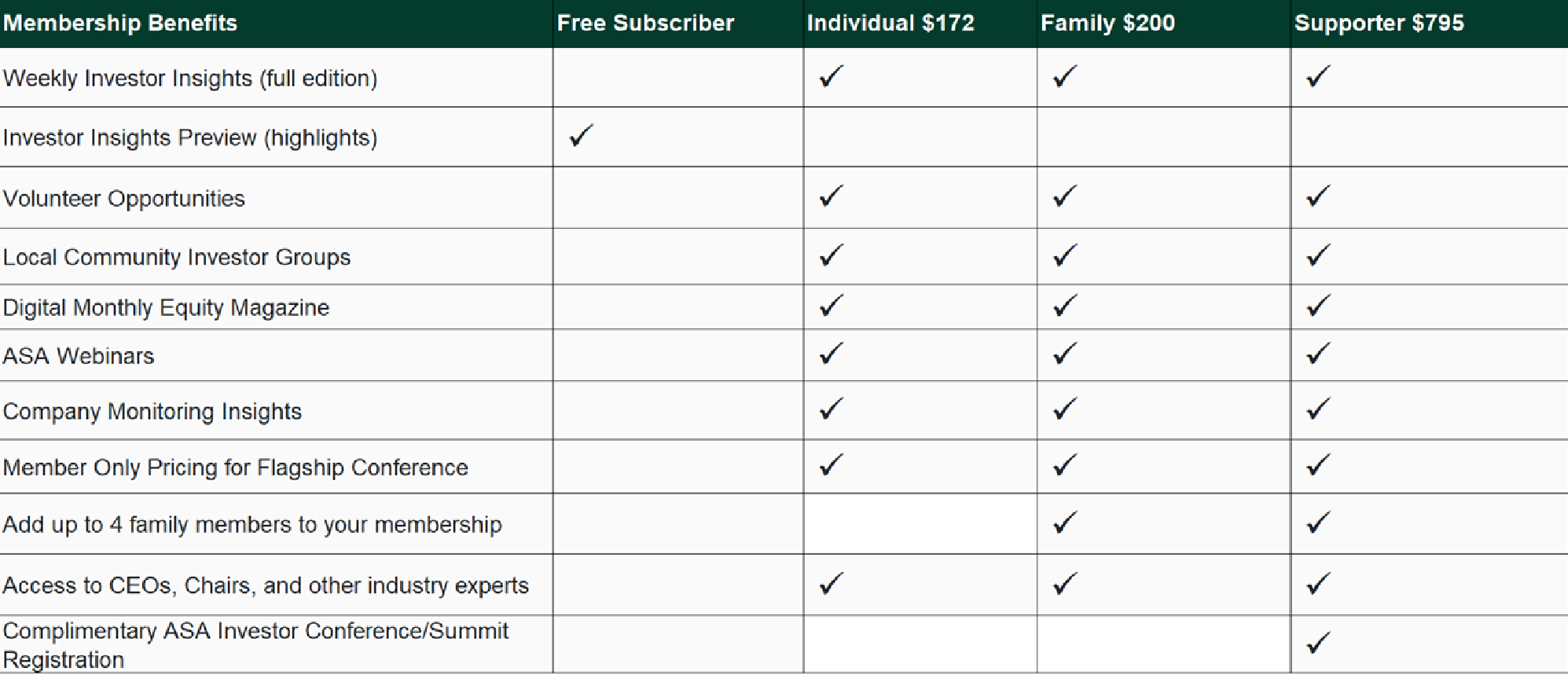 ASA Supporter Membership includes Complimentary ASA Investor Conference/Summit registration.