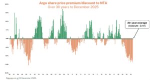 Over time, Argo Investments (ASX: ARG) has traded at both premiums and discounts to its NTA in a largely cyclical fashion. Like many across the sector, Argo is currently trading at a discount. However, over the longer term, historical data shows that, on average, Argo trades very close to its NTA.