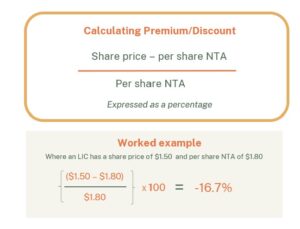 When the share price trades below NTA, the LIC is said to be trading at a discount. When it trades above NTA, the LIC is said to be trading at a premium.